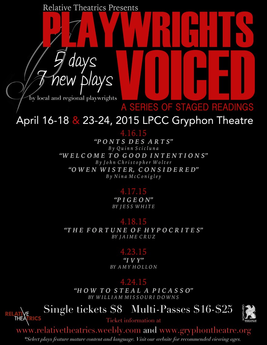Mason says the plays will be presented as staged readings where the actors perform with scripts in hand. Opening night features three short plays. All the other performances feature one play each. “Playwrights Voiced” runs April 16-18 and 23-24 at the Gryphon Theatre in Laramie.