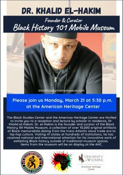The Black Studies Center and the American Heritage Center are thrilled to invite you to a reception and lecture by scholar in residence, Dr. Khalid el-Hakim. Dr. el-Hakim is the founder and curator of the Black History 101 Mobile Museum, a collection of over 10,000 original artifacts of Black memorabilia dating from the trans-Atlantic slave trade era to hip-hop culture. Visiting 41 states at hundreds of institutions, he has received national and international attention for his innovative work of exhibiting Black history outside of traditional museum spaces. Items from the museum will be on display at the AHC.