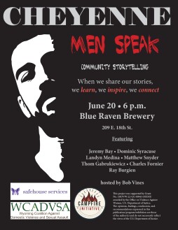 Men Speak Community Storytelling features local men sharing 10-minute true stories about challenging gender stereotypes including hyper-masculinity, the stigma of men's mental health, and substance abuse. The stories are sometimes funny, other times heavy, but always inspiring. Men Speak is sponsored by Safehouse Services and the Wyoming Coalition Against Domestic Violence and Sexual Assault.
