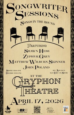 Gather ‘round the Gryphon Theatre stage April 17th for some songwriting magic with the Songwriter Sessions: Songs in the Round. As advertised, Shawn Hess, Zephyr Grey, Matthew Wilburn Skinner, and John Poland will grace the stage at once to deliver a captivating intimate experience you won’t want to miss. They will all take turns sharing songs and stories alike. Come out for something you may have never heard before or for the tales that never get old.