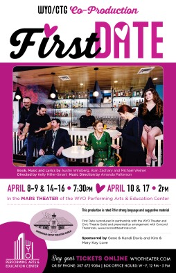 The WYO Theater and Civic Theatre Guild are excited to announce the return of the WYO/CTG Co-Production with First Date, a Musical Comedy by Austin Winsberg. Directed by Kelly Miller-Smart with music direction by Amanda Patterson this hilarious musical comedy will be the first Co-Production for the WYO and CTG after a two-year hiatus and will be presented in the Mars Theater at the WYO Performing Arts & Education Center April 8-10 and 14-17, 2022.