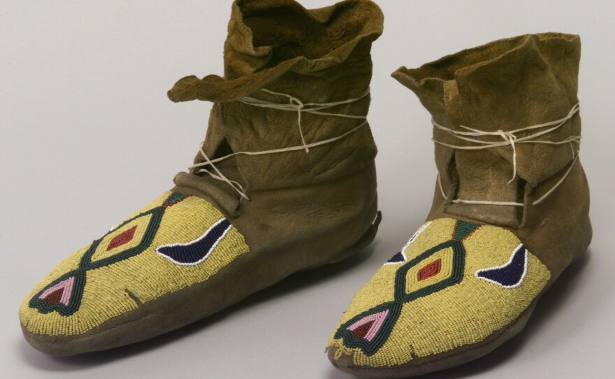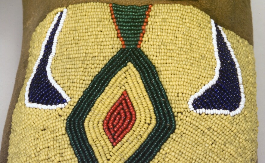That’s why a certain pair of moccasins stood out to her with a vibrant yellow background. The pair is made from tan deer hide and glass beads.